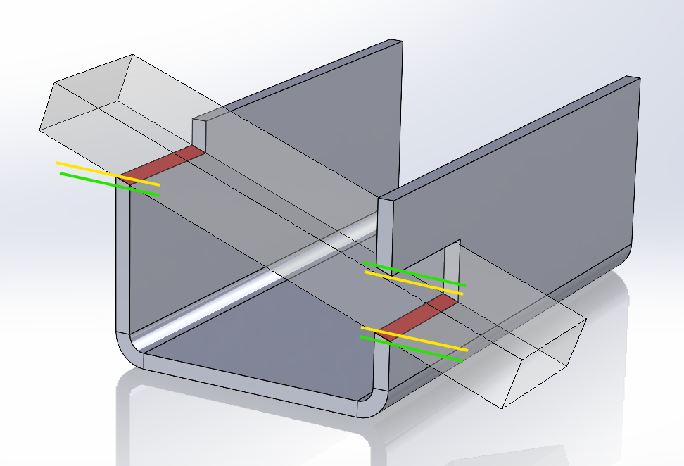 De rode vlakken zijn verkeerd getekend en lopen schuin. Ze staan dus niet haaks op de bovenzijde van de plaat. We moeten dan een keuze maken welke van de twee contourlijnen we moeten aanhouden (geel of groen) om het product weer haaks te krijgen. In dit geval lijkt de groene lijn geschikt, maar we kunnen niet met zekerheid zeggen of dat de juiste interpretatie is. Daarom is overleg met de klant noodzakelijk. Dit veroorzaakt verstoringen in onze planning en mogelijk ook in die van de klant. |